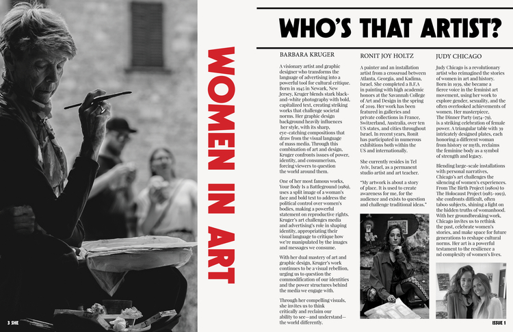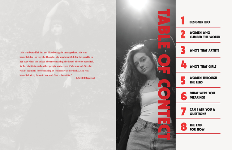 After evaluating what my passion project would be, and the nervousness of a looming deadline. I decided to make my project about the celebration of women. Who they are, what they do, and what their beauty is. Although this magazine does not cover everything amazing about women, I hope it gives a glimpse into how inspiring and strong women are.