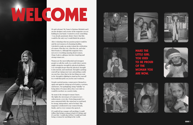She fights the stereotypes of women in Law-enforcement every day. Protecting people in a man-saturated field. She raised me to work hard, be strong, independent, and to be kind. This magazine is dedicated to my women friends, family, and to every woman who opens it.